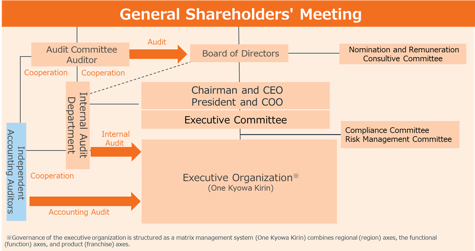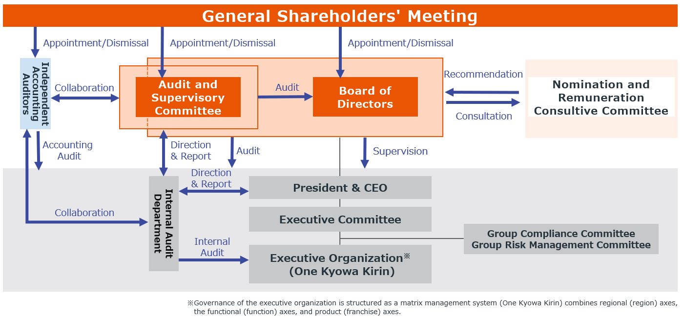 The Company is carrying out its business activities based on a philosophy that “The Kyowa Kirin Group companies strive to contribute to the health and well-being of people around the world by creating new value through the pursuit of advances in life sciences and technologies.” To realize this philosophy, the Company establishes its organizational structure and mechanisms for corporate management, and implements necessary measures. Recognizing that it is important to increase the transparency in corporate management and strengthen the oversight of the management in order to continuously increase corporate value, the Company has established the “Corporate Governance Policy” for the purpose of further improvement of its corporate governance.